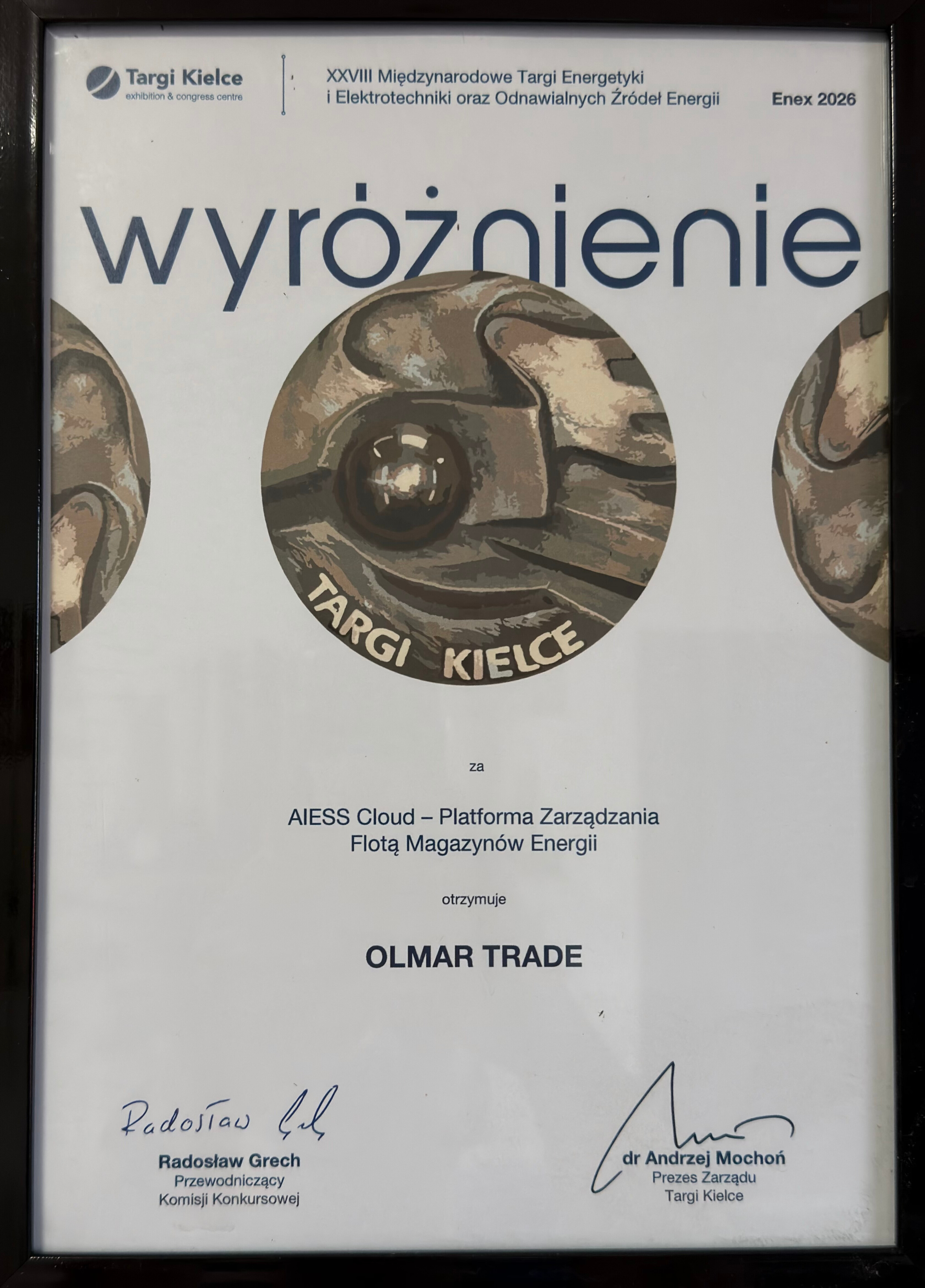 In the ENEX Award 2026 competition, Olmar Trade — AIESS Cloud (a fleet energy storage management platform) received a distinction in the category “Innowacje w OZE” (Innovations in renewable energy). Targi Kielce publishes the official list in their news section.